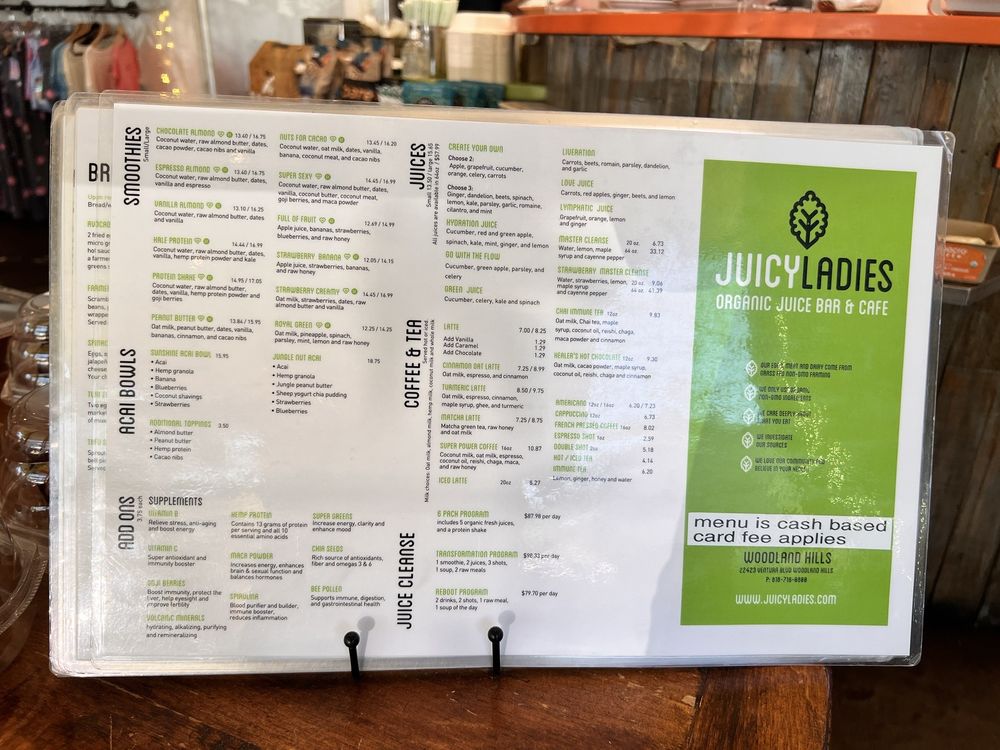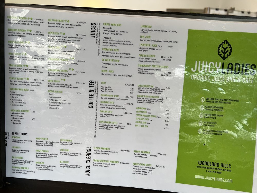 Juicy Ladies is a juice bar, smoothie shop, and café in Woodland Hills that offers a plethora of options for health-conscious diners. The menu caters to various dietary preferences, including vegan options. Customers praise the cozy and welcoming ambiance, perfect for a relaxed breakfast, brunch, or lunch. The outdoor seating and friendly staff add to the positive dining experience. Highlights include the fresh and delicious açaí bowls, juices, protein smoothies, and trendy avocado sandwiches. Despite the high prices, the quality of food and impeccable service make it a worthwhile visit. Regulars rave about the clean and organic choices, along with the attentive and caring staff, notably Manager Jessie and his team. If you're looking for a spot to unwind with nutritious food and beverages, Juicy Ladies is the place to be.