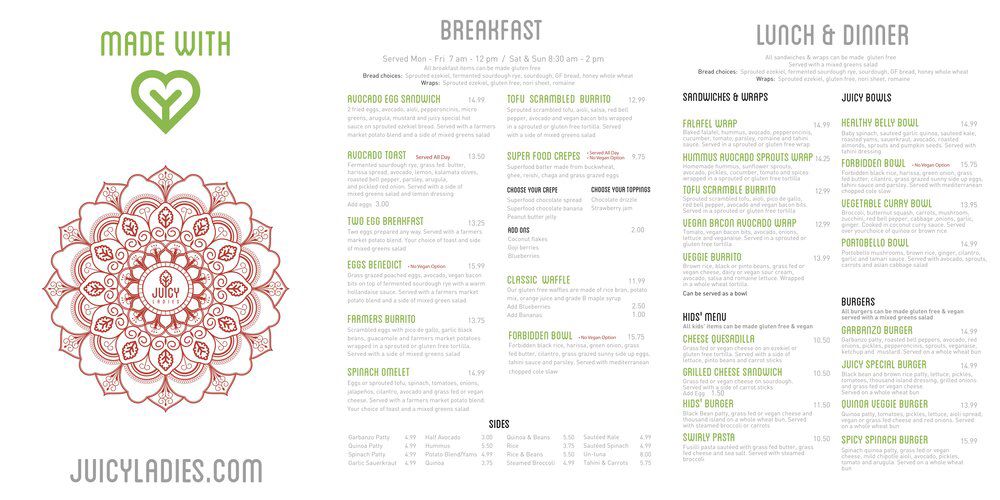 Homemade hummus, sunflower sprouts, avocado, pickles, cucumber, tomato, and spices wrapped in a sprouted or gluten-free tortilla. Served with a side of mixed greens salad. (VEGAN)