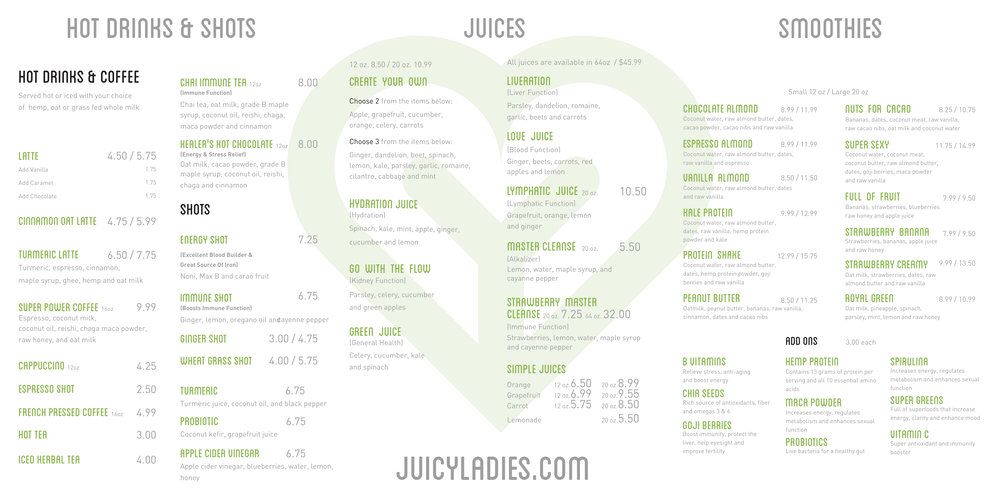 Choose from the items below:Apple, grapefruit, cucumber, orange, celery, carrotsChoose from the items below:Ginger, dandelion, beet, spinach, lemon, kale, parsley, garlic, romaine, cilantro, cabbage and mint